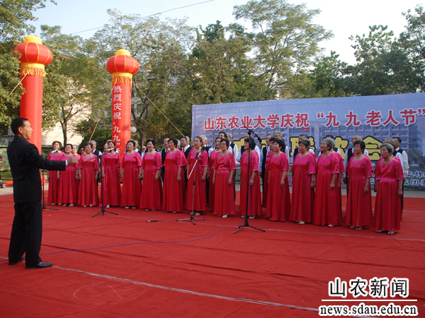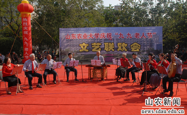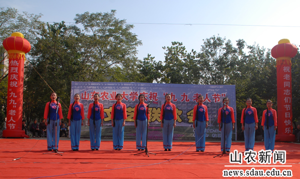 今天的“夕阳红”广场披上了节日的盛装,鲜花、彩球和大红地毯把联欢会的气氛烘托得隆重而热烈。下午2:30,联欢会在老年器乐队的民乐合奏《沂蒙山小调》和《茉莉花》那优美的旋律中拉开帷幕。在近2个小时的时间里,老年艺术团和大学生艺术团两代人,先后表演了女声小合唱、太极云波扇、舞蹈、京剧联唱、中老年服装模特表演、中老年健身操、琴与剑、大合唱表演等十余个文体节目。