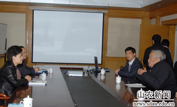 在园艺学院会议室,束怀瑞院士向邢善萍介绍了苹果中心的建设运行情况,包括主要研究成果、团队构成、经费分配、人员配备等,并就学校的高端人才培养提出建议。束院士认为,“学校一定要注意培养、吸引高水平、有影响力的高端人才,使他们能在生产实践和理论研究水平方面都达到较高水平,向新的院士岗位发起冲击。”