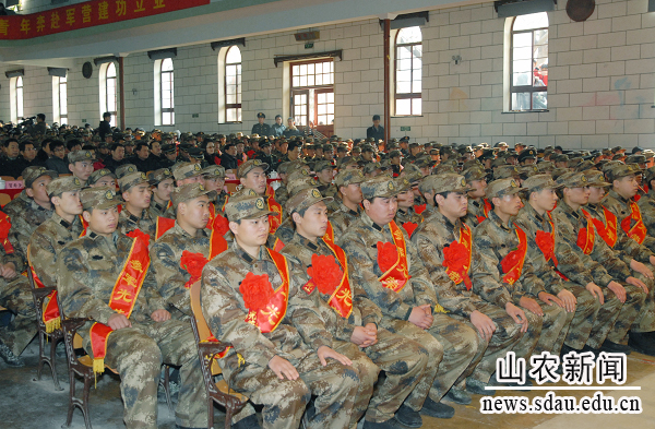参加大会的600多名新兵身着崭新的军装,胸前佩戴红花,脸上洋溢着自豪骄傲的神情。据介绍,今年山东省入伍新兵中,大学生占28.8%,兵源质量较往年有较大提高。此次在大学校园里召开欢送新兵大会,是深入开展征兵宣传进校园、进一步加强高校国防教育的一项具体举措。