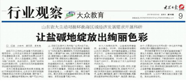 12月21日,《大众日报》以“让盐碱地绽放出绚丽色彩”为题,对山东农大主动对接环渤海区域经济发展需求开展科研的办学实践进行了专题报道。文章称,多年来,山东农大的科研团队、专家教授在盐碱地上研究、示范、推广良种良法,获得了政府和社会的高度认同,让昔日白花花的盐碱地呈现出越来越绚丽的色彩。