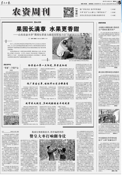 12月21日,《农民日报》以《果园长满草 水果更香甜》(通讯员:杨宇 张铁成 记者:吕兵兵)为题,用超过1/2个版面报道了我校陈学森团队“果园生草省力高效培肥地力法”技术转让纪实。文章说,近日,山东省烟台烟富农业科技有限公司与WilliamHill官方网站签订协议,以15万元的价格获得该校陈学森教授的“果园种植长柔毛野豌豆的省力高效培肥地力法”技术的独家使用权。长柔毛野豌豆是一种常见的豆科野草,匍匐在地上生长,很不起眼,大多数人不认识它。15万元,无论对一家企业还是一所高校而言,都算不上“大钱”。但这份技术转让合同的签订,却是写就了一篇打造生态果园、推进水果产业健康发展的大文章。(阅读全文请点击图片)