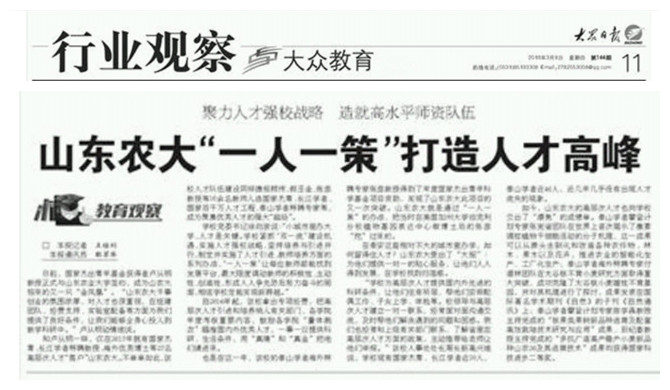 3月8日,《大众日报》以《聚力人才强校战略 造就高水平师资队伍:山东农大“一人一策”打造人才高峰》为题刊发文章,详细介绍学校高层次人才引育工作,称赞山东农大在“双一流”建设中坚持培养与引进并行,为人才成长打造过硬环境,已经成为聚集优秀人才的强大“磁场”。