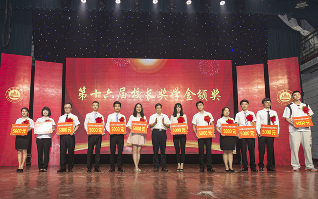 晚会上,校长张宪省为获得第十六届校长奖学金的毕业生颁奖。