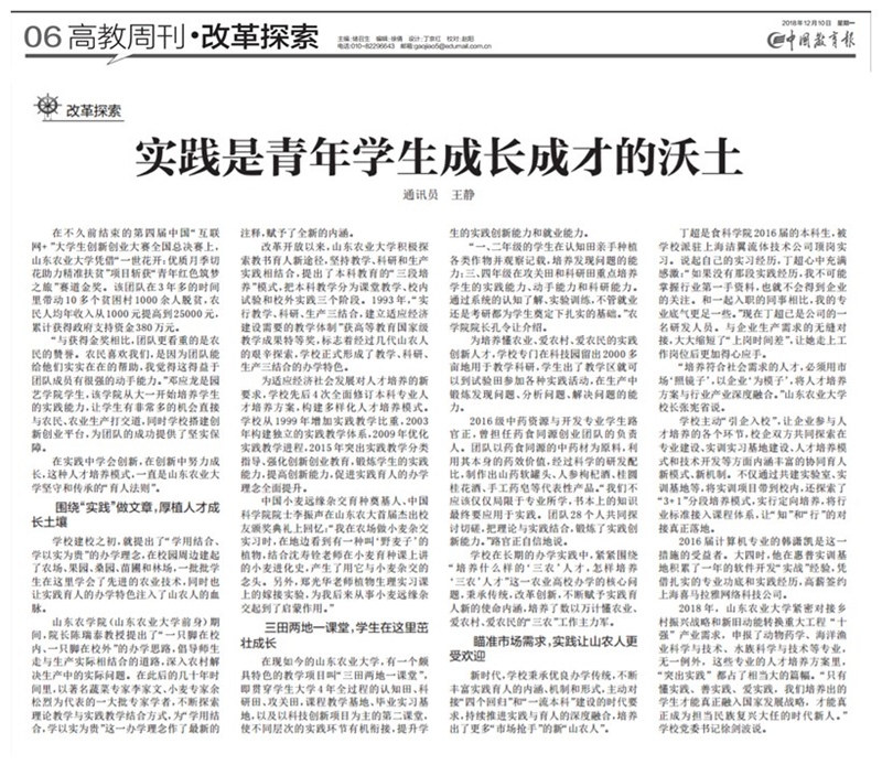 12月10日,《中国教育报》在《改革探索》版面刊发题为《实践是青年学生成长成才的沃土》文章,详细报道WilliamHill官方网站坚守和传承实践育人特色,在实践中培养担当民族复兴大任时代新人的特色做法。文章从“围绕实践做文章,厚植人才成长土壤”“三田两地一课堂,学生在这里茁壮成长”“瞄准市场需求,实践让山农人更受欢迎”3个角度切入,通过大量鲜活的实例,全景展现了学校推进实践教学改革的历史脉络和育人成效,为WilliamHill官方网站引导青年学生“在实践中学会创新,在创新中努力成长”的“育人法则”点赞!