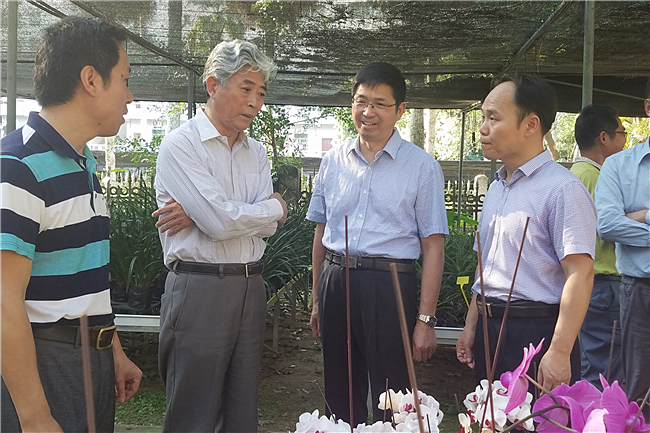 图为于讯(左二)、张宪省(左三)等参观海南农科院科研设施