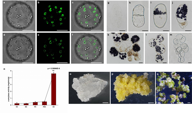 曾范昌团队基于早期挖掘出的棉花体胚发生相关蛋白,进一步探讨了脂质转运蛋白(SELTP)和相应的淀粉酶调控棉花离体细胞胚性分化启动的细胞学过程与生物学功能,鉴定出体细胞胚性起始再分化的分子与生化标记。研究发现,在体胚分化过程中,脂质转运蛋白特异性地定位于细胞器淀粉体质膜上,组装的淀粉质体细胞器构成了细胞中强大的能量电池。两个显著的细胞事件决定了体细胞向胚性细胞的转变:首先脂质转运蛋白(SELTP)组装的淀粉体介导了体细胞进行不对称分裂,建立细胞极性;随后细胞中的淀粉体被激增的淀粉酶裂解,淀粉质体电池急剧放电,驱动细胞启动全能性,促进细胞胚性分化与植株再生。