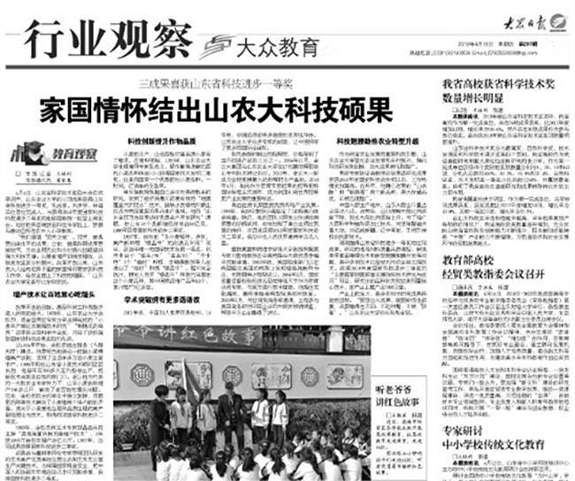 4月18日,《大众日报》刊发通讯文章,以我校获得3项2018年度山东省科技进步一等奖为切入点,介绍学校倡树“顶天立地”科研理念,引导专家教授根植家国情怀,在服务经济社会中取得丰硕科技成果的生动实践。