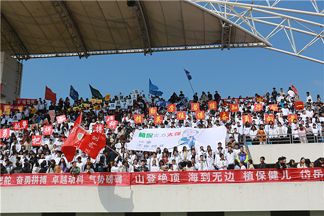 春光旖旎,雨后乍晴。党委书记徐剑波宣布运动会开幕。由300名学生组成的跆拳道队伍率先登场,整齐划一的姿势、标准到位的动作将跆拳道的一招一式淋漓尽致地演绎出来,赢得了在场观众的阵阵喝彩;伴随着悠扬的乐声,150余名教职工代表们身着蓝白色服装,为现场观众呈现了一场刚柔并济的太极拳表演;400名师生参加的大型团体操在绿茵场上变幻多姿,造型多样,“五星红旗”“70”“2019”等造型不仅彰显了农大人热爱祖国、奋进担当的新时代情怀,更将表演推上了高潮。