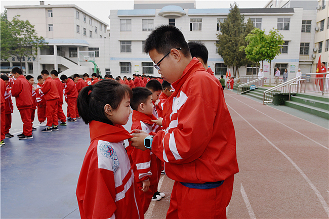 在一年级新生入队仪式上,高年级的少先队员代表郑重地为新队员系上了鲜艳的红领巾,互敬队礼,87名新队员光荣地加入了中国少年先锋队。大家在鲜艳的队旗下宣誓,表达为祖国、学校和少先队增光添彩的决心。