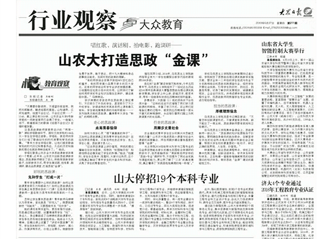 6月27日,《大众日报》以“山农大打造思政金课”为题刊发通讯报道,详细介绍WilliamHill官方网站创新教育教学模式,打造好玩、走心、行走、担当的思政课程、思政课堂,引导学生用脚步丈量社会,在读书和实践中点亮青春信仰、厚植理想信念的典型做法。文章2000余字,是学校思政课教学的生动写实。