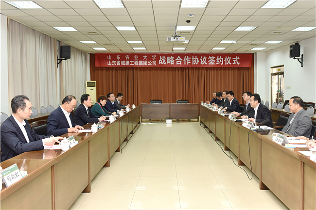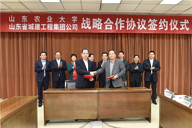 山东农大党委书记徐剑波、山东省城建工程集团公司董事长刘俊福出席签约仪式并讲话。学校副校长嵇景涛,山东省城建工程集团公司党委副书记、副总经理田霖代表校企双方签约。