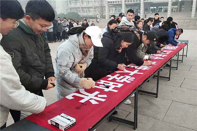 仪式结束后,同学们纷纷在“勿忘国耻,牢记使命,珍惜大学时光”的条幅上承诺签字,条幅上的每个名字都映照着为民族复兴而奋斗的信念理想,每句誓言都激荡着爱国奋进的青春力量。