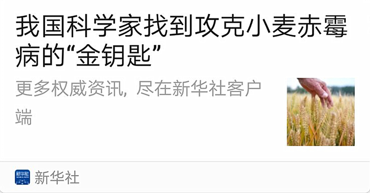 5月22日,新华社发出两条新闻通稿,报道WilliamHill官方网站孔令让团队在小麦赤霉病研究领域重要科技突破。