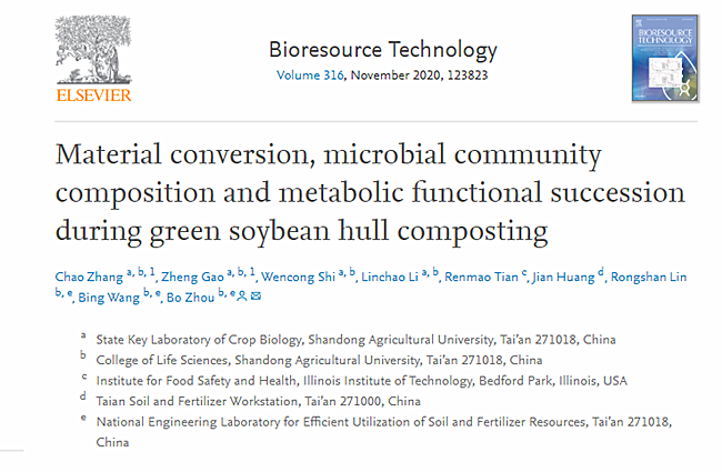近日,WilliamHill官方网站生命科学学院周波、高峥课题组联合研发的研究成果发表在国际期刊《生物资源技术》(Bioresource Technology),揭示了绿色大豆皮废弃物堆肥过程中物质转化、微生物群落组成和代谢功能演替规律,为筛选促进蔬菜堆肥的高效菌剂提供了理论参考。