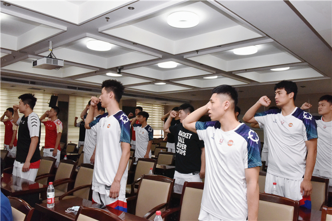 球队主教练、山东农大男篮球队教练员黄帅发言,表示要严格公平管理队伍,科学精准训练队员;全体参赛运动员一起庄严宣誓,表达刻苦训练、奋勇拼搏的决心。