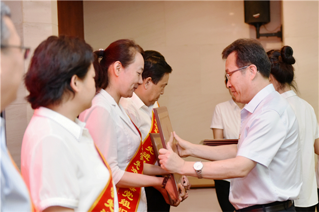 全体在家校领导出席会议。徐剑波、张宪省、朱莉为受表彰代表颁奖。嵇景涛宣读表彰决定。党委常委、组织部部长岳远彬主持会议。