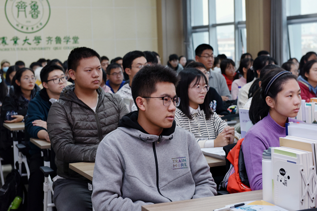 谈及学校发展情况,张宪省深情回忆自己1978年入学时的感受,从教学科研设施到校园建筑与环境,娓娓道来。他语带自豪地说:“山东农大以立德树人为根本,以强农兴农为己任,与时代同频共振,培养出一大批优秀人才,为我国经济社会发展作出了贡献,得到社会各界的好评。”他希望齐鲁学堂学生传承发扬山东农大人优良品质,向老师和优秀校友学习,把人生理想和祖国前途、民族命运紧密联系在一起,为国家富强、民族振兴、人民幸福贡献一己之力,争做新时代的优秀农大人。