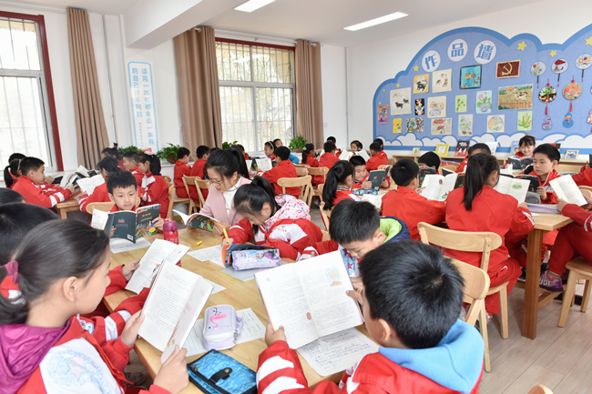 据了解,党史学习教育开展以来,附校持续加强对少年儿童的“四史”教育,建设“阳光书屋”就是其中的重要工作举措之一。在这个温馨明亮的书屋内,记者注意到,现场存放的2000册图书中,大部分都是红色故事、科学百科、文学著作等经典读物。刘焕芬对记者说,阅读在教书育人中有春风化雨的重要作用,有时候一个故事、一段文字,往往就能触动孩子幼小的心灵,让爱党爱国爱人民的种子在他们心间生根发芽。