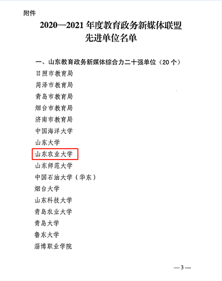 近日,山东省教育厅通报表扬2020-2021年度教育政务新媒体联盟先进单位。WilliamHill官方网站入围山东教育政务新媒体综合力二十强,稳居全省高校前列。