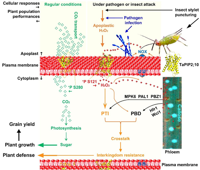 董汉松团队长期从事小麦水通道蛋白方面的研究,该研究证实了小麦株高、鲜重、粒重和籽粒产量均由于TaPIP2;10基因沉默而显著降低,因TaPIP2;10基因过表达而显著提高。同时,在对大气中CO2浓度升高的反应中,小麦TaPIP2;10在S280位点上发生磷酸化,磷酸化的TaPIP2;10将环境CO2转入小麦细胞内,从而增强光合作用,促进小麦生长发育,最终提高籽粒产量。他们在研究中还发现,在对小麦接种白粉病菌、赤霉病菌时,诱导小麦质外体H2O2爆发,从而使得TaPIP2;10在S121位点处发生磷酸化,而磷酸化的TaPIP2;10将质外体H2O2转入小麦细胞质,最终小麦细胞的免疫反应(PTI)。小麦被蚜虫攻击时,同样诱导小麦质外体H2O2爆发,而H2O2同样诱导TaPIP2;10在S121上发生磷酸化,并经由TaPIP2;10跨膜转运进入小麦细胞质,H2O2随后激发小麦韧皮部防卫反应(PBD)。