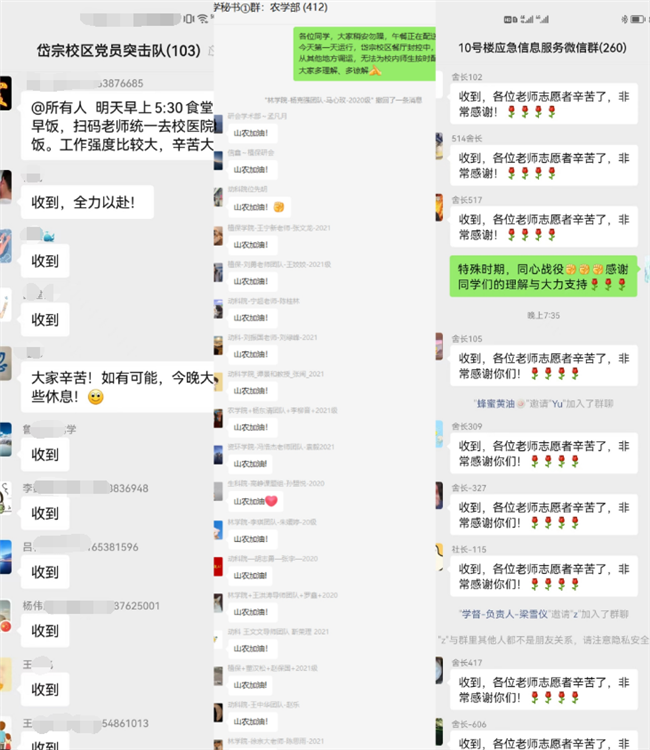 面对疫情,学生们团结一致,为农大加油呐喊,展现出农大学子的风采。他们按照学校要求,第一时间做到“足不出户(宿舍)”,积极配合进行核酸检测,没有任何怨言,没有丝毫慌乱。各个学院的学生微信群里,“山农加油!”的呼声在屏幕中不停闪现。“老师,我们知道学校疫情防控不容易,我们也想为学校抗疫贡献力量。老师,如果有需要请及时联系我们,我们永远站在学校身后。”动科学院2021级硕士研究生李晓敏诚挚地向辅导员老师表达为学校作贡献的想法。与学校共进退,与疫情作斗争,农大校园里精诚团结、共同奋斗的青春力量,让人为之深深动容。