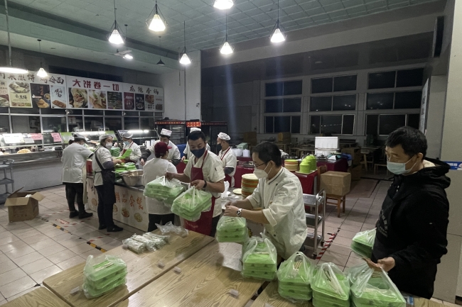 为了让封控在宿舍的1.3万余名学生吃上饭、吃饱饭、吃好饭,学校紧急调配面包、牛奶、水等食品物资,餐厅工作人员加班加点在餐厅做好可口的饭菜,并为每一位学生分装好。在急需配送人员时,学校教职工党员突击队员、学生志愿者挺身而出,冲到最前线,将一份份盒饭送进学生宿舍,送到每一个学生手里。不单单如此,这些教职工党员突击队员还协助师生核酸检测、校园管控、环境保护与消杀、后勤保障等工作,让党旗在“战”疫第一线高高飘扬。