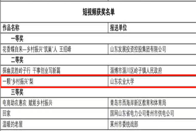 1月9日,“2022山东乡村振兴典型案例推选活动暨乡村振兴短视频大赛”名单正式发布。学校推荐报送的《校企融创 科技赋能 山东农大产教融合助力乡村全面振兴》获评山东乡村振兴典型案例一等奖,《一颗“乡村振兴”梨》获评乡村振兴短视频大赛二等奖。