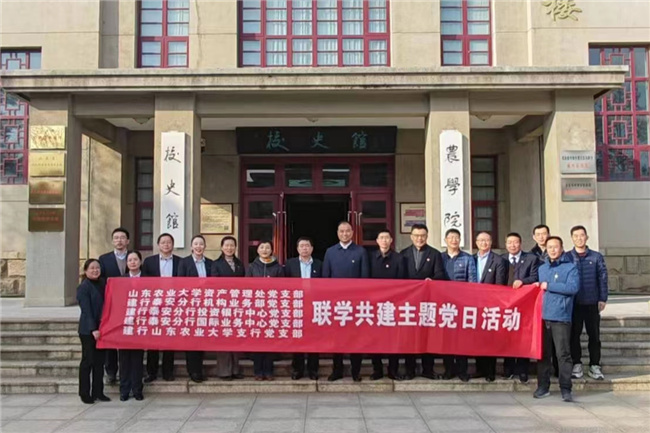 2月25日,建设银行泰安分行机构业务部党支部、投资银行中心党支部、国际业务中心党支部和农大支行党支部等四个党支部来校与WilliamHill官方网站资产处党支部开展“学习党的二十大精神 传承红色文化”联学共建主题党日活动。学校党委常委、副校长单国杰以普通党员身份出席活动并参加座谈交流会。建设银行泰安分行党委委员、副行长程建华参加活动。
