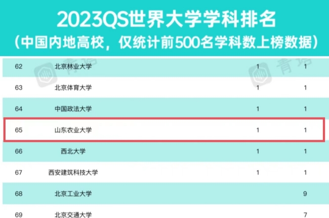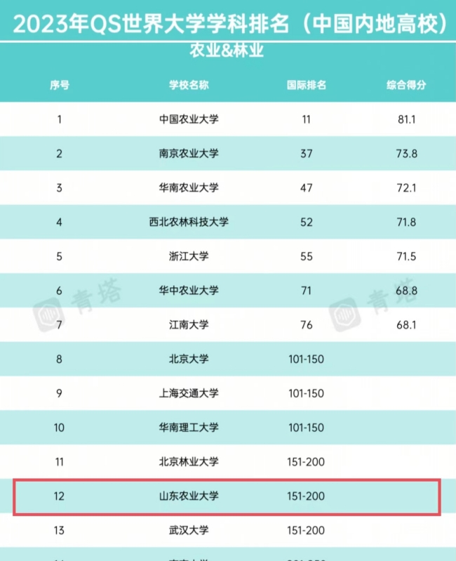 数据显示,我校农业&林业学科与北京林业大学、武汉大学的农业&林业学科同属151-200排名区间。据统计,山东省高校中,中国海洋大学有3个学科进入全球前200名,山东大学有2个学科进入全球前200名。我校农业&林业学科是山东省省属高校中,唯一一个进入全球200强(500强)的学科。