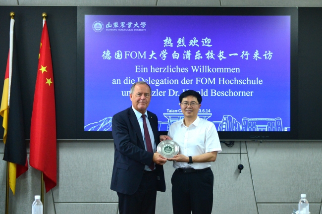 6月14日,德国埃森经济与管理应用科技(FOM)大学行政校长白潇乐博士一行来访,学校党委副书记、校长冷畅俭会见客人并座谈交流,探讨深入推进国际合作事宜。党委常委、副校长辛杰主持座谈会。