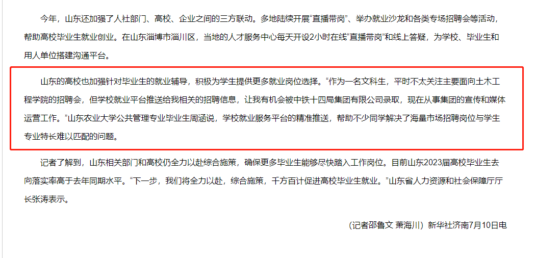 近日,新华每日电讯发表题为《加强校企联动 扩大就业容量——山东全力拓宽毕业生就业渠道》的新闻报道,文章报道了山东通过增加招聘活动场次、扩大就业容量、拓展就业渠道等方式,努力促进高校毕业生高质量充分就业的典型做法,其中报道关注了我校就业服务平台为毕业生提供精准推送,帮助他们解决了海量市场招聘岗位与专业特长难以匹配的问题。部分原文报道如下: