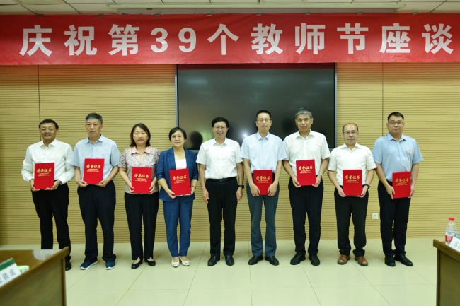 9月8日,第39个教师节来临之际,学校召开座谈会交流教育教学工作经验,表彰先优典型。党委书记徐剑波出席会议并讲话,代表学校向奋战在教书育人、管理育人、服务育人岗位上的全校教师和教育工作者致以节日的祝贺,勉励大家要有坚定的信念、高超的本领、高尚的师德、过硬的担当,在学校争创“双一流”征程中作出应有的贡献。党委副书记、校长冷畅俭,副校长林海出席座谈会并为受表彰教师代表颁奖,党委副书记嵇景涛主持座谈会。党委常委、副校长王勇宣读表彰决定。