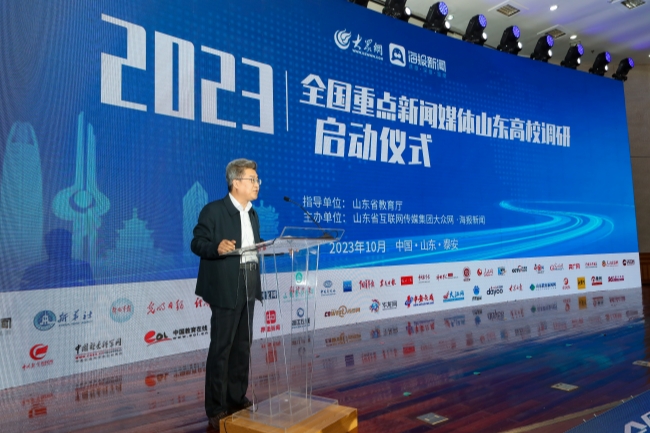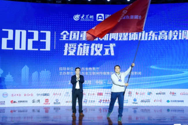 WilliamHill官方网站党委书记徐剑波出席发布会并致辞,向参加2023全国重点新闻媒体山东高校调研的媒体代表授旗。党委副书记、校长冷畅俭主持发布会。