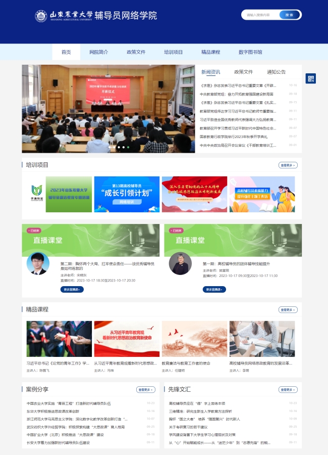 该平台建设是学校深化辅导员“6+1”精培工作法的创新举措,运用先进网络技术,整合优质培训资源,以提高培训质量为核心,不断满足辅导员日益增长的个性化、差异化学习需求。平台搭建了“培训信息管理、网络教学研修、培训效果评估”一套完整的网络培训系统,培训内容同步国家教育行政学院、中国教育干部网络学院、全国高校辅导员网络学院全部课程资源。学校可根据实际需求,自选课程开展辅导员专题培训。平台同时开发了PC端门户网站和APP手机学习端。