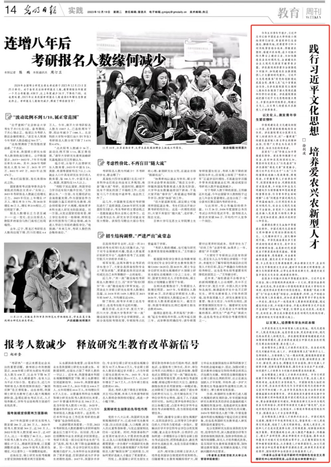 12月19日,《光明日报》刊发学校党委书记徐剑波署名理论文章。文章指出,习近平文化思想聚焦“用党的创新理论武装全党、教育人民”这个首要政治任务,为涉农高校落实立德树人根本任务提供了强大思想武器和科学行动指南。涉农高校承担着为全面推进乡村振兴、加快建设农业强国提供人才支撑的时代重任,要深刻把握习近平文化思想的重大意义、丰富内涵和实践要求,构建以文化人、以文育人的爱农兴农新型人才培养体系,培养更多具有爱农情怀、国际视野和全球胜任力的高素质人才。文章全文如下: